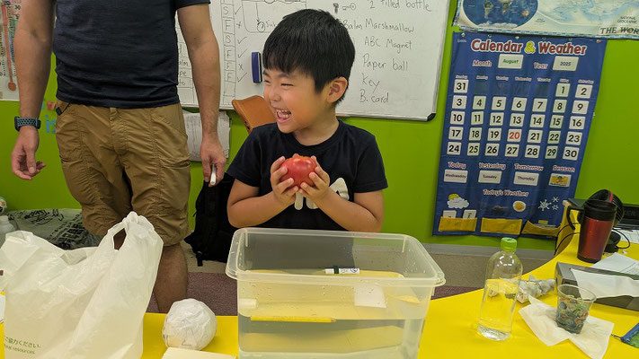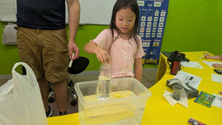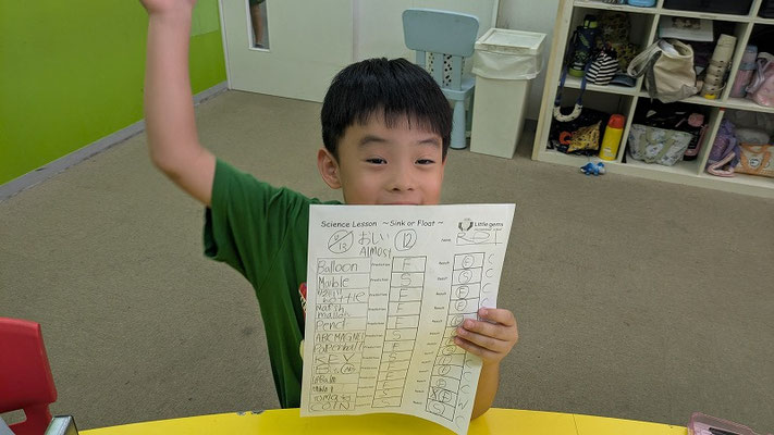まず、昨日はScienceを行いました!E-classは「Sink or Float(沈むか浮かぶか)」といういくつかのものが水に浮かぶか沈むかを予測して実際に実験してみるものです。今回は小学校高学年の子もいたので、少し難しめにしてみました。「Half filled bottle(半分だけみずが入ったペットボトル)」など大人でも迷うようなものを入れてみました。それでも13問中12問正解の子もいました!!Good job!!
