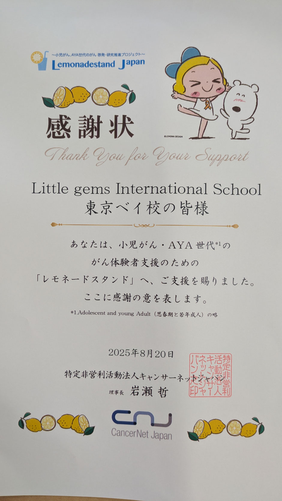 25日 8月 2025 Lemonadestandの感謝状が届きました! こんにちは、先日開催したLemonadestandの募金活動に対して、NPO法人キャンサーネットジャパンより感謝状が届きました! スクール内に掲示させて頂きます!取り急ぎ感謝状をブログ上でも共有致します。 tagPlaceholderカテゴリ: