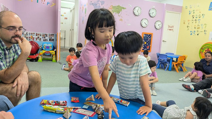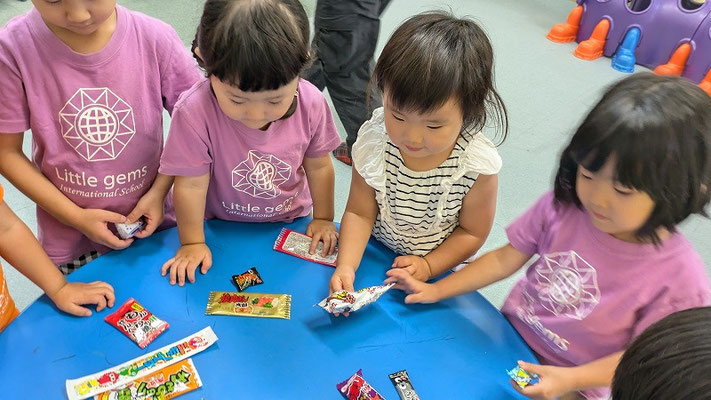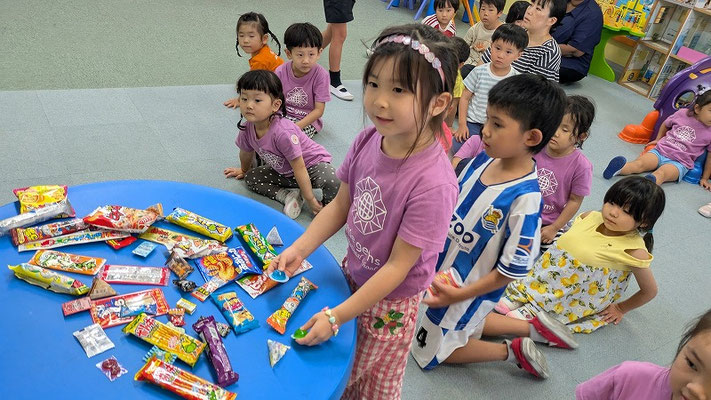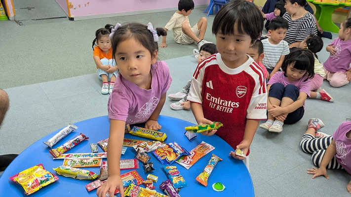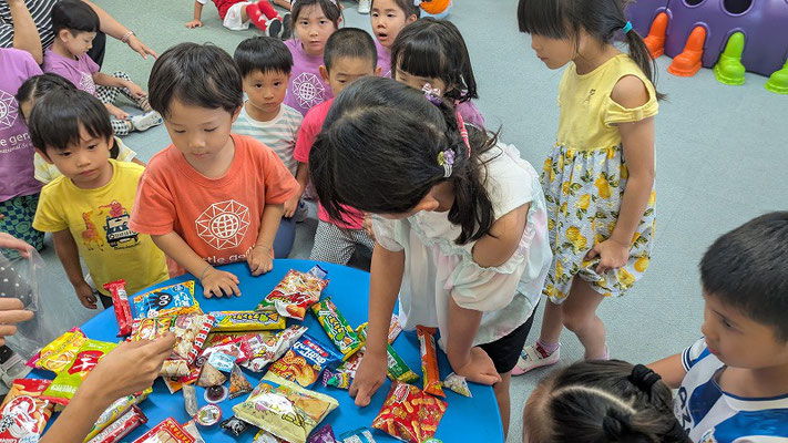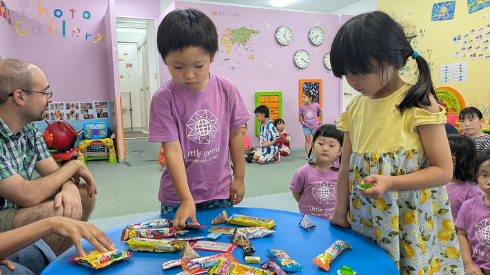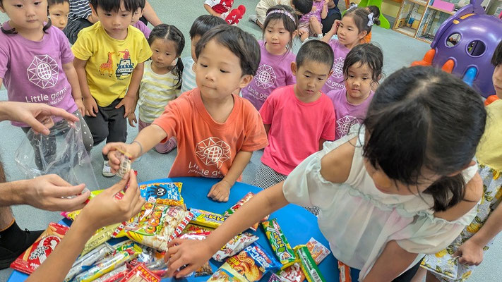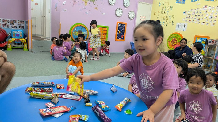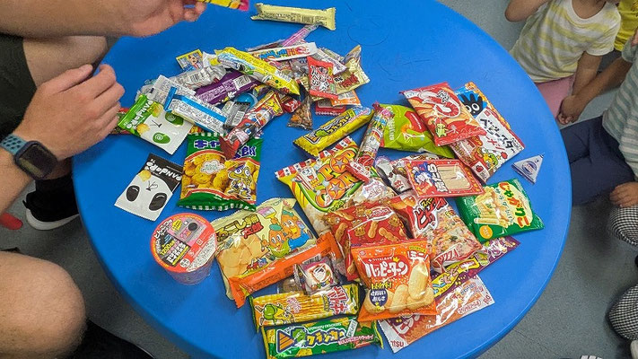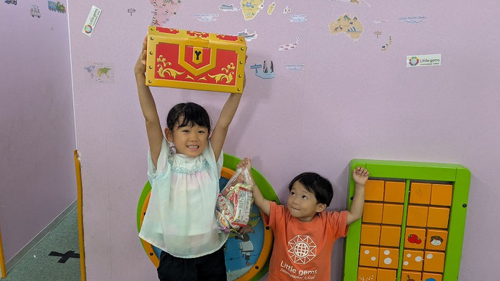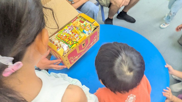 スクールに戻ってから、Treasureの中身を確認。たくさんのSnackが入っていたので、みんなにもおすそわけ、良かったね!!