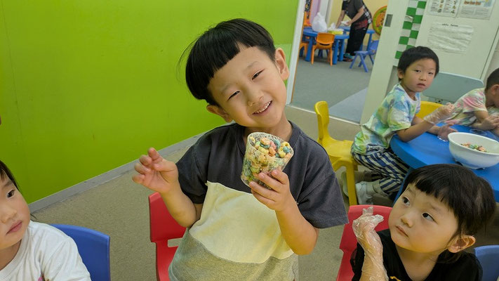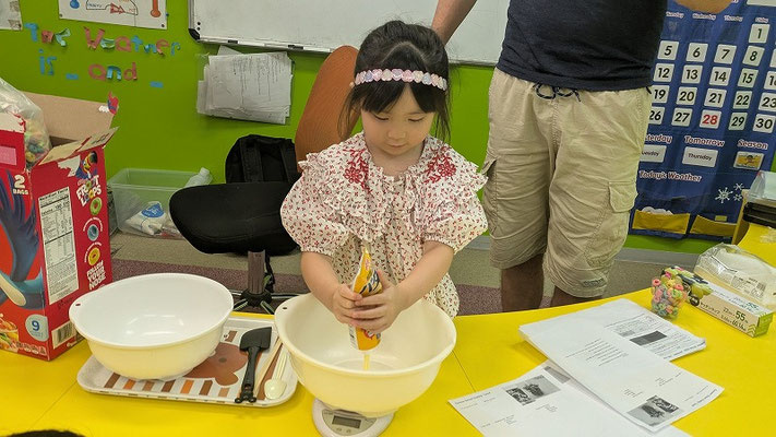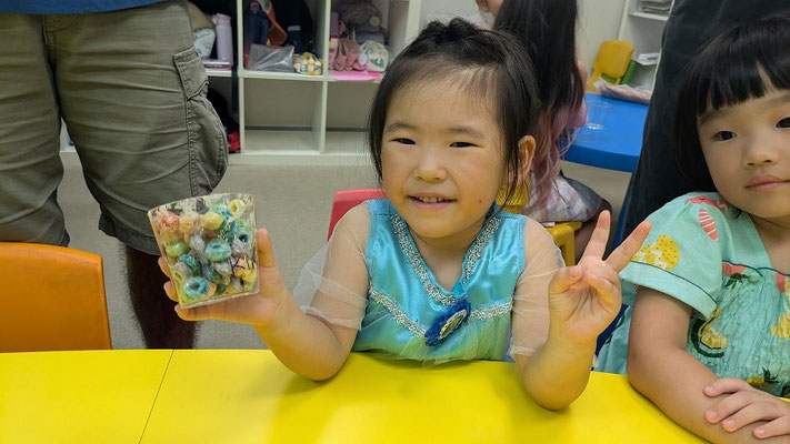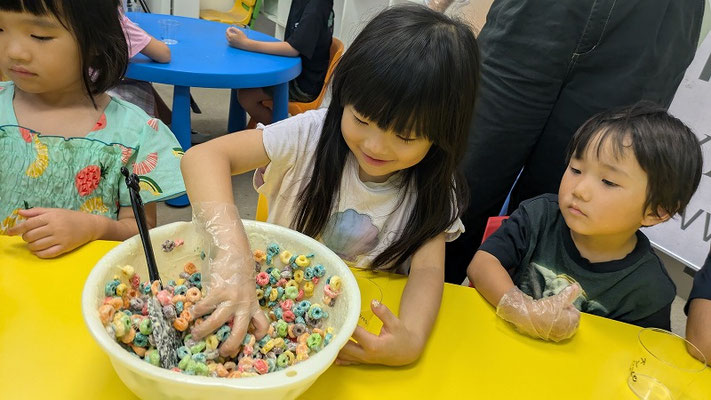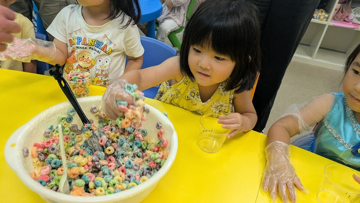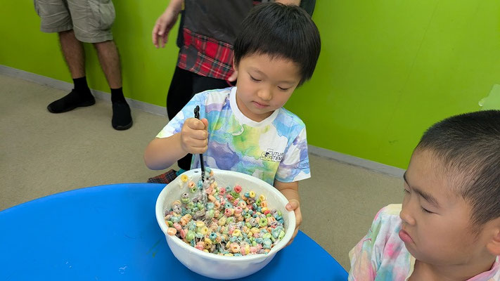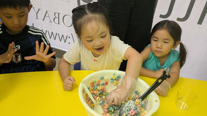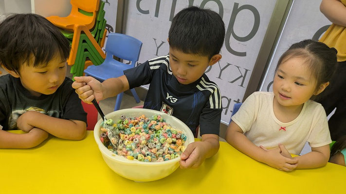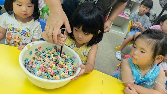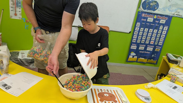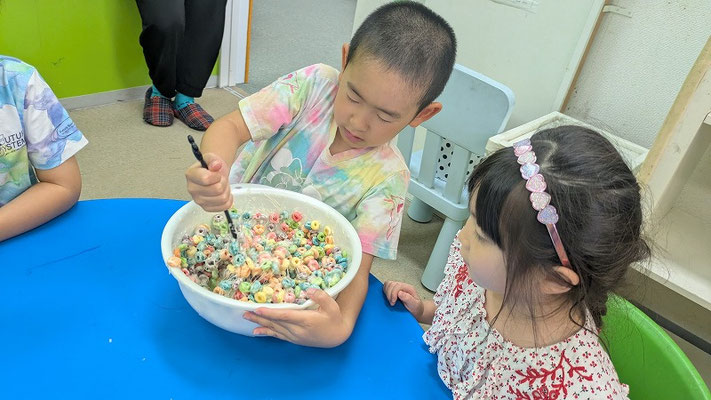 本日はCookingを行いました。テーマがInternational cultureなので、海外では日本以上にポピュラーな「Serial(シリアル)」を使ったクッキングを行いました。主材料に使った「Froot loops」は、日本ではお目にかかる事はほとんどないですが、海外では非常に有名で、先生たちも「子供のころよく食べた!懐かしい!」と言っていました。